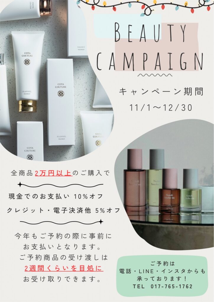 ✨年末に向けて、髪も心も美しく整えていただけるよう、スタッフ一同心を込めてお手伝いします。ぜひこの機会に、お気に入りの商品をお得にお求めください。